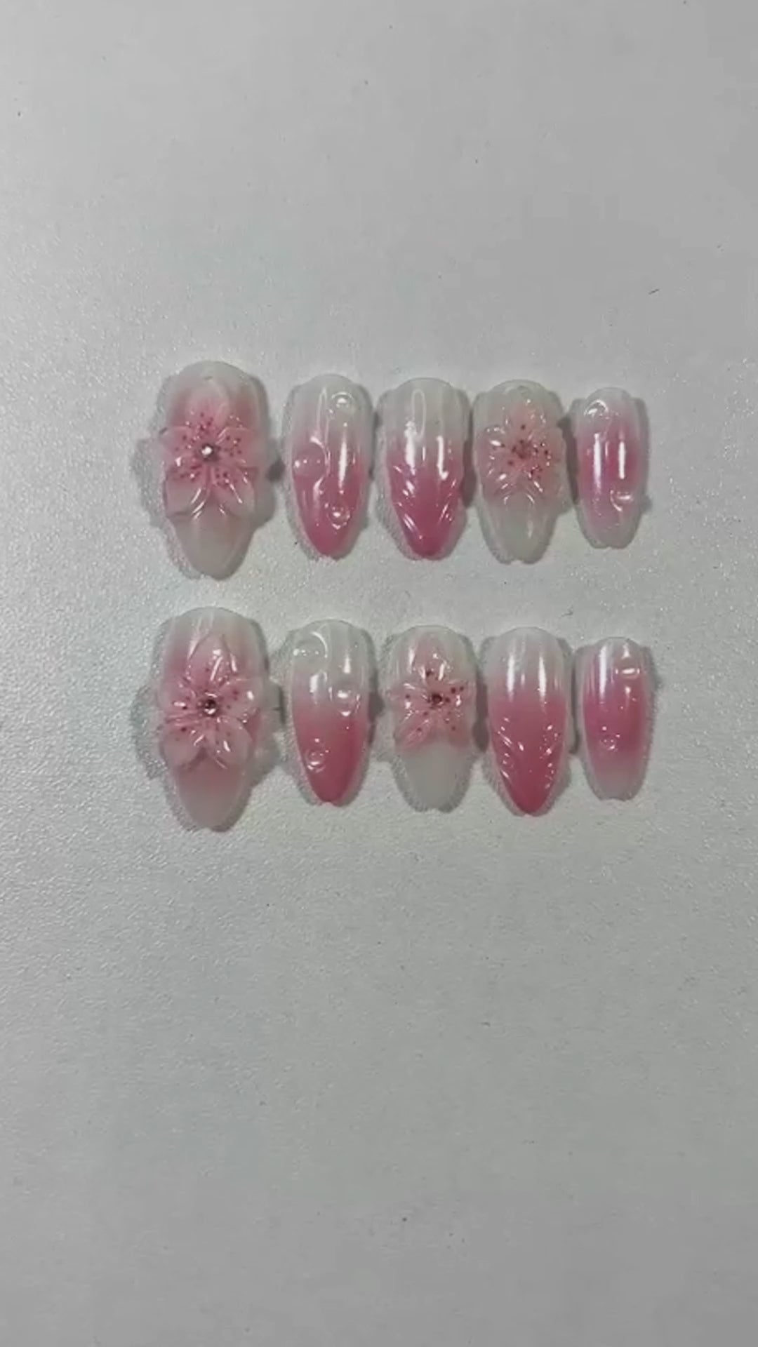 Pink Ombre Press On Nails with 3D Sakura Flowers & Dew Drops