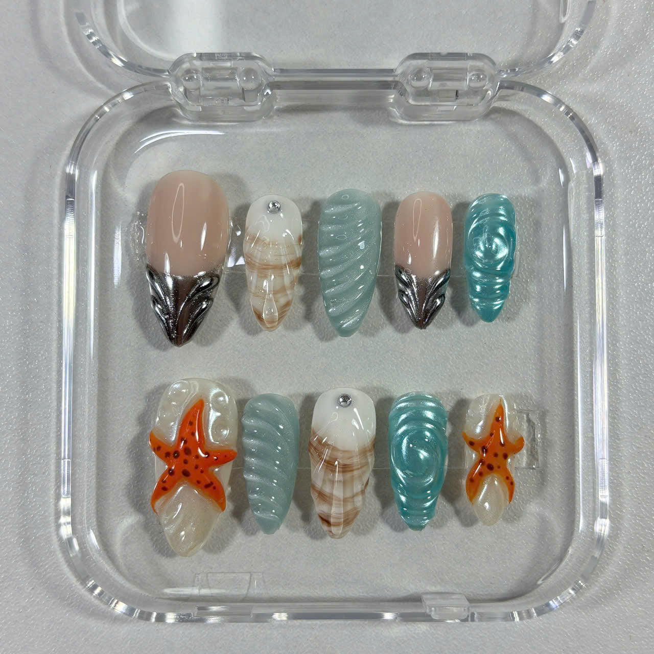 Ocean Shell Press On Nails, 3D Starfish Nail Art, Beachy Summer Nails, Glossy Seashell Texture